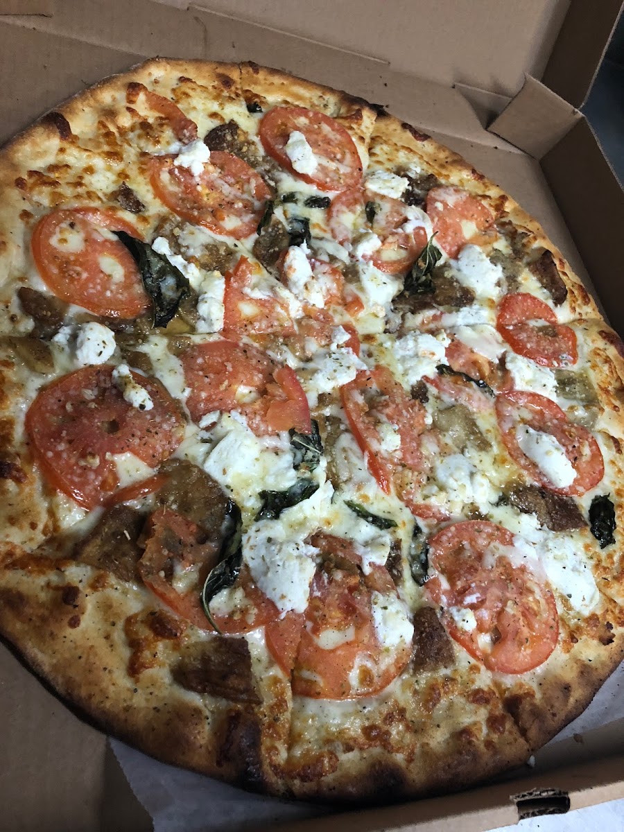 Eggplant, fresh tomato, garlic, basil, Ricotta, olive oil. (usually White) Gluten-free option available for small pizzas only.